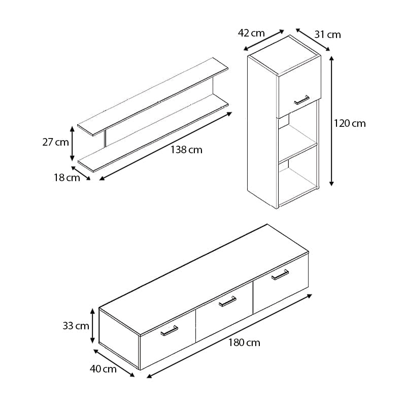 - The composition consists of a TV stand, a shelving unit and a wall cabinet.
